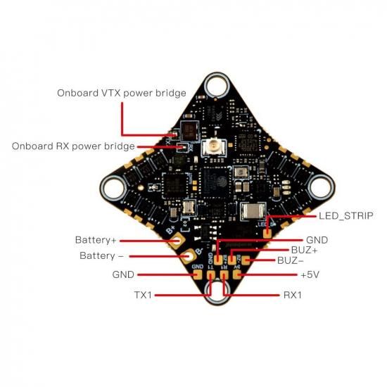 UART ExpressLRS受信機およびOpenVTX送信機を内蔵しており、65mmクラスの1SマイクロFPVドローンに最適です。