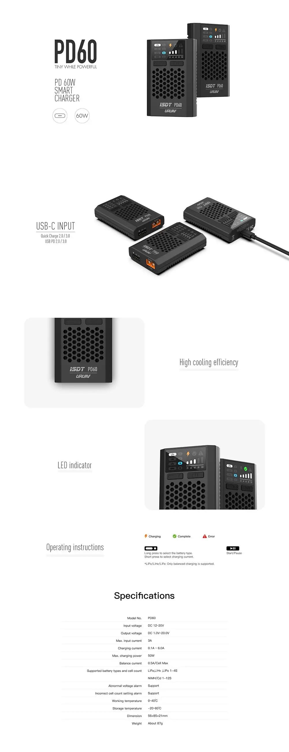 ISDT URUAV PD60 60W 6A Type-C 入力バッテリーバランス FPV 充電器