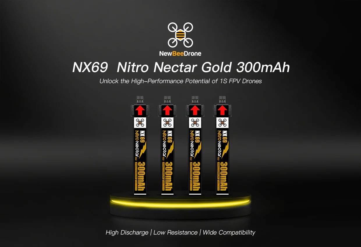 NewBeeDrone Nitro Nectar NX69 300mAh HV LiPo Battery(4本セット)は、1S FPVレース機やフリースタイル機で、80Cの高放電性能を最大限に引き出すために設計されたバッテリーです。新世代コネクター「NX69」を採用することで、BT2.0 コネクターと比べて実測ピーク電流が 4.81% 向上(26.38A 対 25.17A)。より力強いスロットルパンチ、鋭いレスポンス、そして高負荷フライト中でも安定したパワーを提供します。