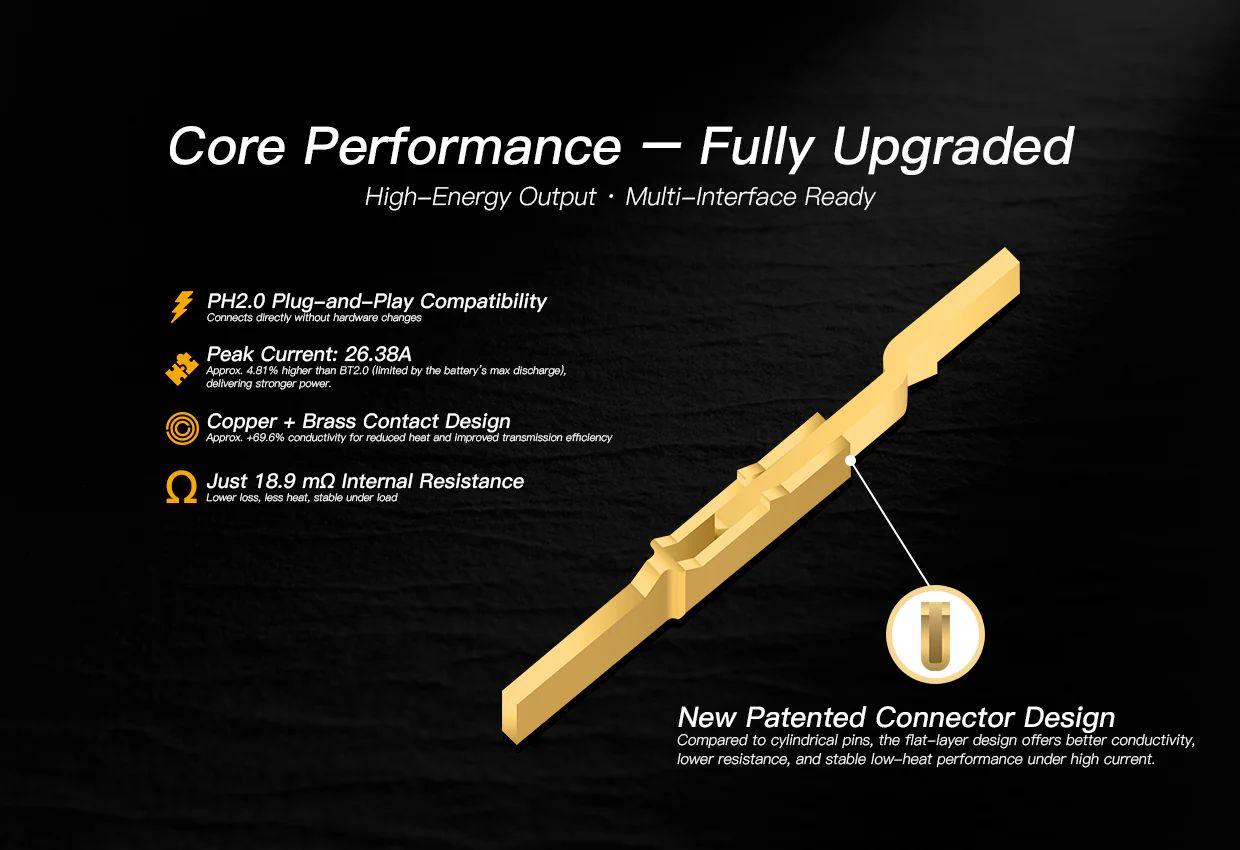 既存のPH2.0充電器でも充電可能。 PH2.0 Goldコネクターとの組み合わせでも、BT2.0比 約96.38%のピーク電流 をキープ。追加投資を最小限に抑えながらアップグレードできます。