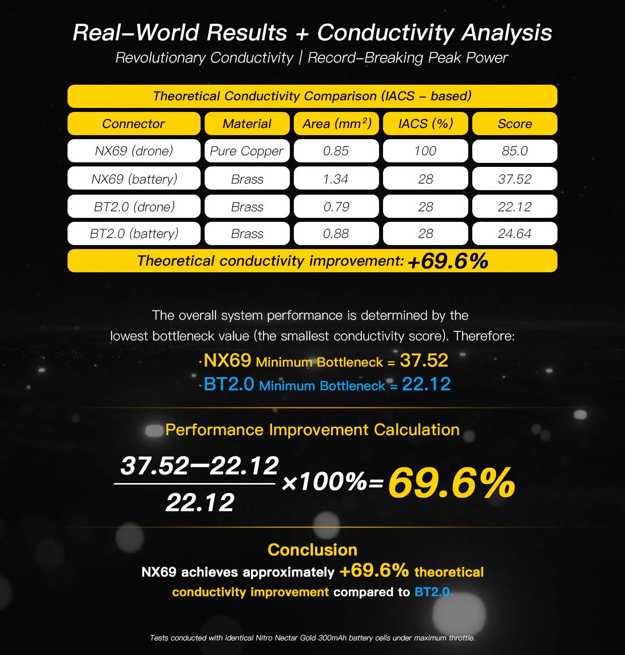 機体側は純銅(0.85mm²)、バッテリー側は大型化した真鍮コンタクト(1.34mm²)を採用。 BT2.0比で +69.6% の理論導電性向上 を実現し、これが「NX69」という名称の由来にもなっています。