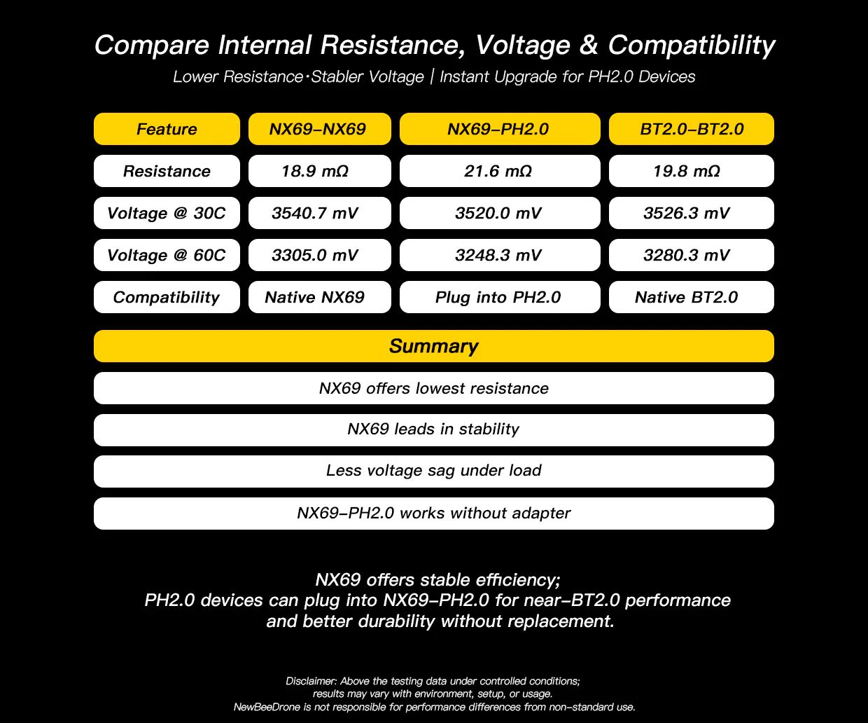さらに、NX69 は PH2.0 システムとの後方互換性を持っています。PH2.0 Gold コネクターと組み合わせた場合でも、BT2.0 のピーク電流の約 96.38% を維持できるため、既存設備を活かしつつスムーズでコスト効率の良い移行が可能です。